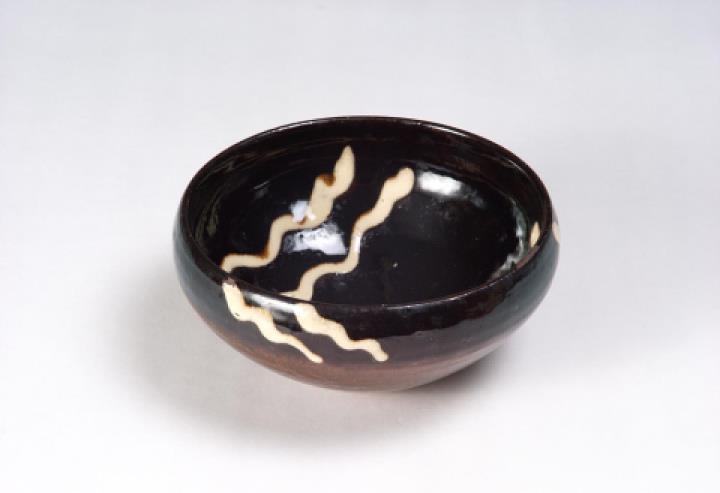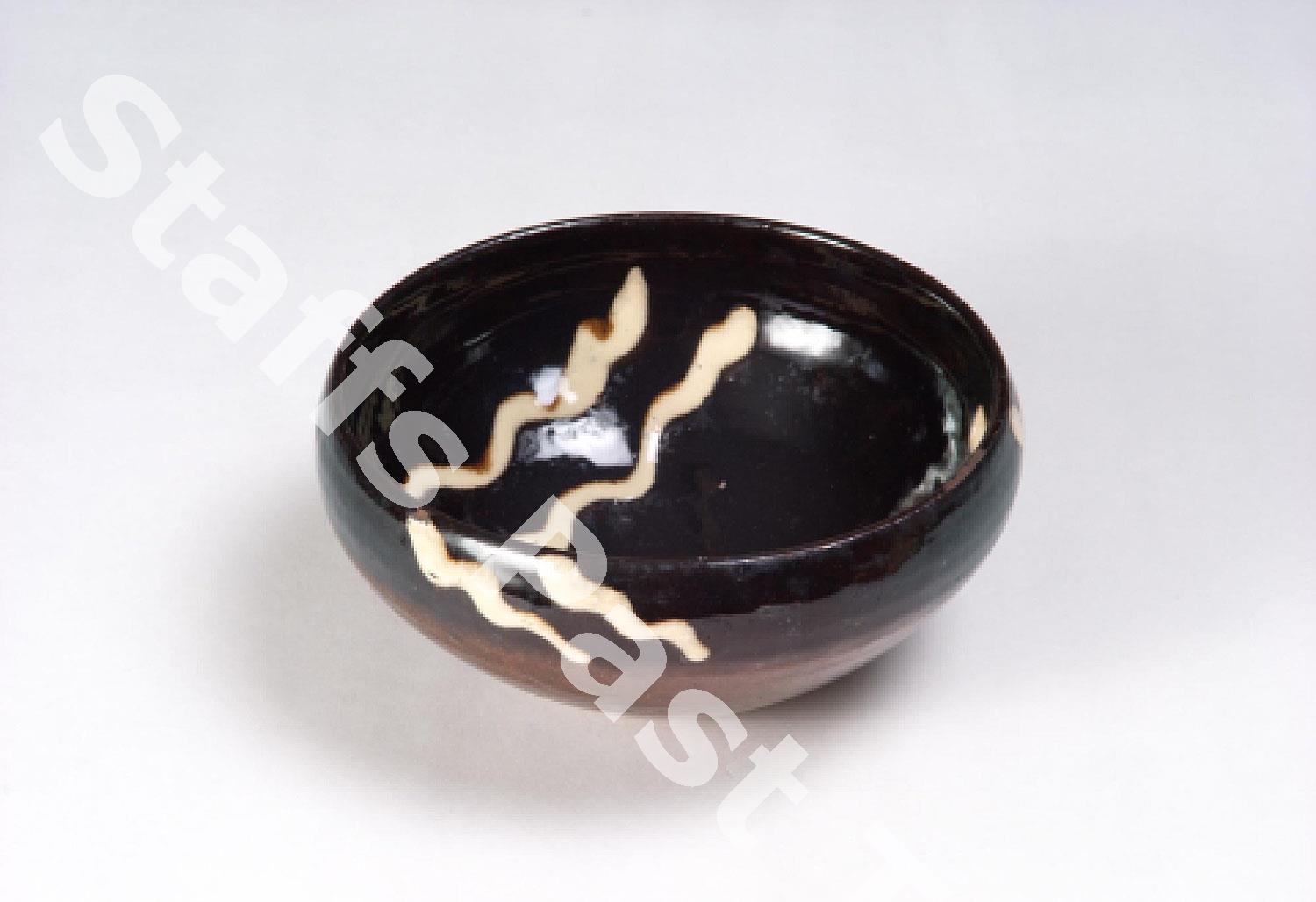 Black/brown slip with stylised slip trailed decoration in cream, lead transparent glaze, base unglazed.